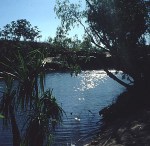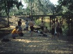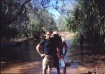 Efter några spännande och intressanta dagar var det så dags att lämna byn och resa mot Darwin igen för att möta deltagarna till didjeridu resan. Vår samlingsplats var en uteservering på Mitchell Street. Efter att ha druckit upp kaffet och räknat in gruppen vid vår samlingsplast lastade vi på vår packning och gjorde oss redo för avfärd söderut. 12 förväntansfyllda människor från olika delar av världen var nu redo för mötet med den aboriginska kulturen på dess hemma plan. Efter en resa på ca 4 timmar var vi framme i Katherine, här stannade vi till för att inhandla mat inför veckan, det finns förvisso en liten butik i Wugularr men utbudet är betydligt större i varuhusen i Katherine. Shoppingvagnen fylldes med vitt bröd, läsk, korvpaket, görnsaker, frukt etc. Med fyllda tankar, både i bil och kropp reste vi så vidare österut längs East Arnhem Road. En väg som strax övergår till en smal grusväg med oändliga raksträckor. Damm molnen av röd sand yrde bakom bilarna när vi närmade oss Wugularr. Som bostad fick vi använda en byggnad som vanligtvis gästande byggnads arbetare brukar använda. Här fanns ett allrum där vi käkade och umgicks, kök, toa, dusch. I huset finns 7 små rum med madrasser samt några enstaka sängar. Vi döpte raskt om stället till Wugularr Hilton, att påstå att rummen skulle vara skinande blanka och dammfria vore en lätt överdrift. Dock fyllde byggnaden alla behov man kan ha under vistelsen. Det var bara att stänga av städinstinkten och installera sig i rummen som skulle vara ens hem under den kommande veckan. Efter att ha lagat mat, ätit och gjort oss hemmastadda oss i våra rum promenerade vi bort till floden för ett kvällsdopp. Frågan var oundviklig, finns det krokodiler här ? Nej inte just nu, men ibland strax efter regnperioden och översvämningarna kan någon enstaka saltvattens krokodil hamna här löd svaret. Det kändes väl inte helt betryggande, men man får lita på lokal befolkningen. Så allihop dök i det härliga vattnet för en simtur.