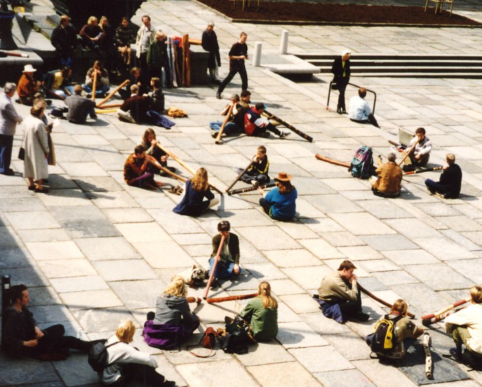 1997 -98 var Alan Dargin kursledare i Falun Folkmusik festival och det blev en jättekick. Alan lärde ut hur man lyssnar på och skapar rytmer, detta var otroligt intressant. Gary Thomas en duktig vit australiensare var i Falun samtidigt som Alan, även Gary kom med en hel del goda och intressanta råd. I samband med kursen i Falun -97 så knöt vi ihop ett kontakt nät (Skandinaviska Didgeridoo Föreningen) där jag blev styrelsemedlem. 1997 hade vi också en stor happening på Götaplatsen i Göteborg i samband med en invigning av en aboriginsk konstutställning. Jag hade tidigare haft en del kontakt med Etnografiska museet och de bjöd nu in oss till att inviga utställningen. Med start 1999 började vi ha våra sk didjeridu konvent 1 gång om året. Vi har hittills varit i Alingsås, Uddevalla, Göteborg och Stockholm. 2003 ser det ut som om träffen blir i Oslo.
