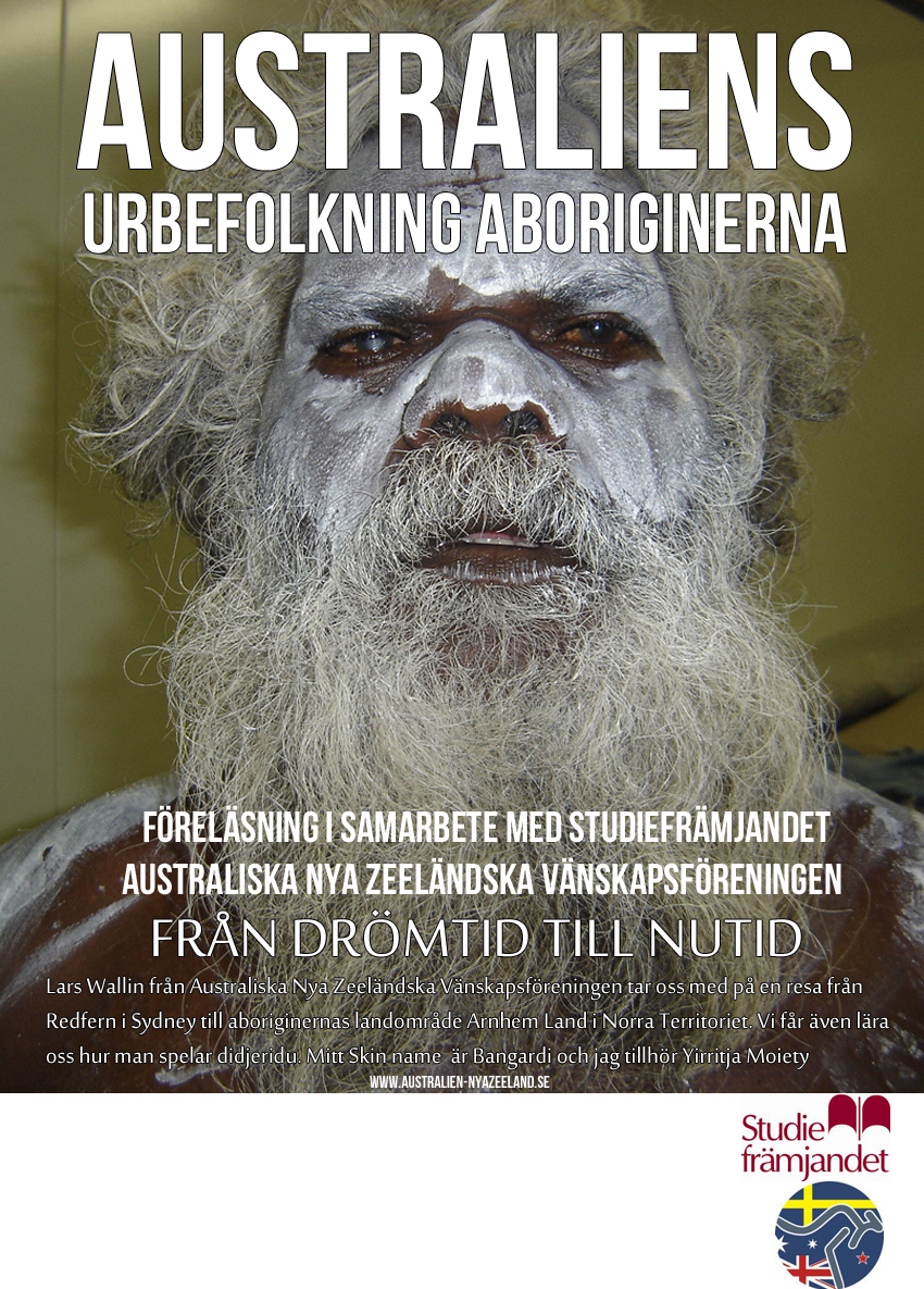 Lars Wallin från Australiska Nya Zeeländska Vänskapsföreningen föreläser om aboriginerna – mänsklighetens äldsta obrutna kultur. Lars tar oss med på en resa från Redfern i Sydney till aboriginernas landområde Arnhem Land i Norra Territoriet. Vi får även lära oss hur man spelar didjeridu.